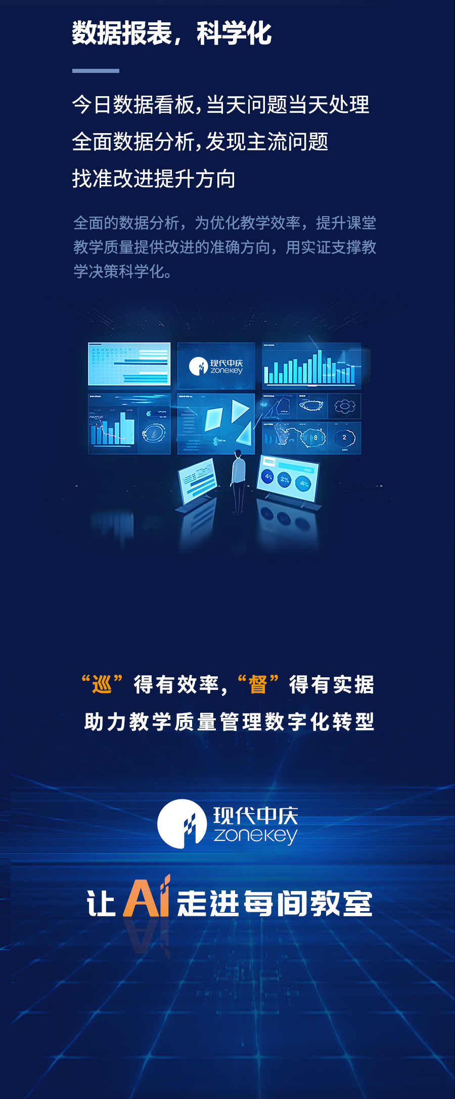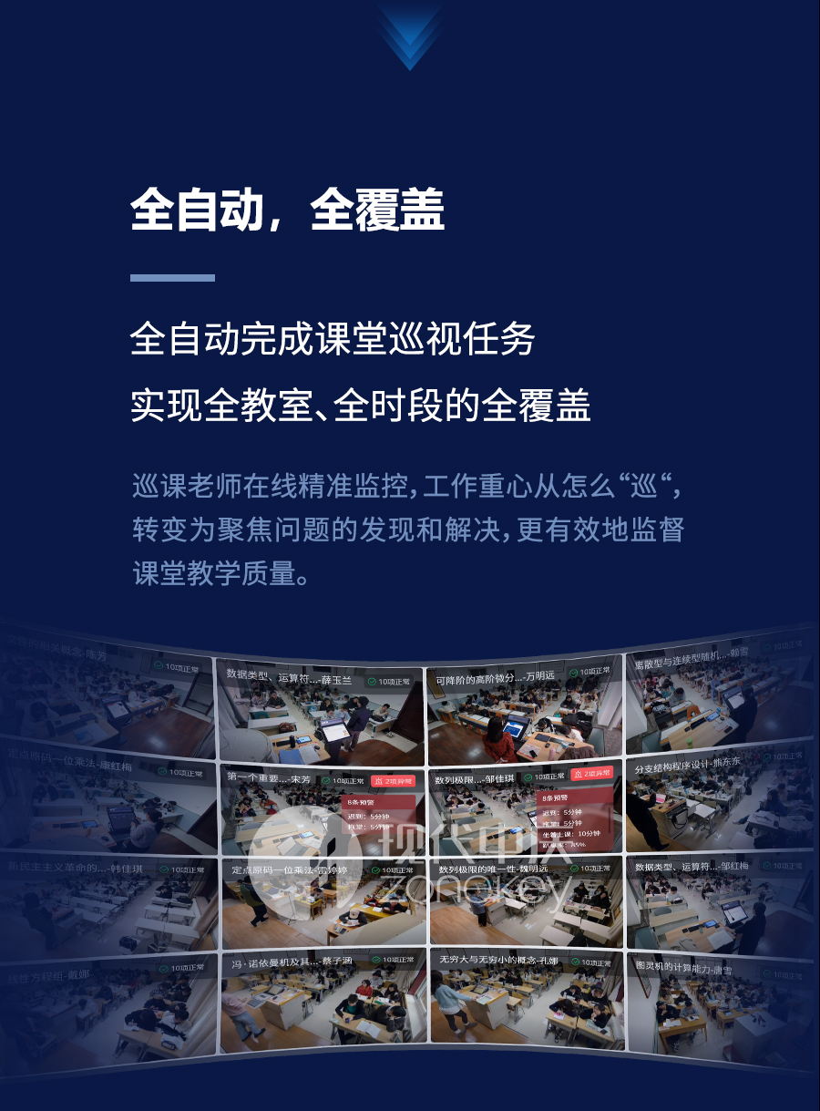 AI巡課與督導(dǎo)評(píng)價(jià)系統(tǒng)以人工智能技術(shù)為核心,通過中慶智能終端設(shè)備實(shí)現(xiàn)批量課堂音視頻錄制和數(shù)據(jù)挖掘,實(shí)時(shí)分析教師和學(xué)生的課堂行為數(shù)據(jù),自動(dòng)取證課堂違規(guī)或者低效行為,實(shí)現(xiàn)全方位AI自動(dòng)巡課。產(chǎn)品破解傳統(tǒng)巡課課堂覆蓋不足,發(fā)現(xiàn)問題具有偶然性,數(shù)據(jù)難以統(tǒng)計(jì)分析等難題,讓學(xué)校“巡”得有效率,“督”得有實(shí)據(jù),有效助力提升課堂教學(xué)質(zhì)量,促進(jìn)教學(xué)管理智能化、數(shù)據(jù)化發(fā)展。